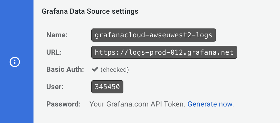 aws cloudformation create-stack, including the required variables:aws cloudformation create-stack --stack-name grafana-aws-logs-firehose --template-body file://./aws-logs-firehose.yaml --capabilities CAPABILITY_NAMED_IAM \ --parameters \ ParameterKey=FallbackS3BucketName,ParameterValue=aws-logs-fallback \ ParameterKey=FirehoseStreamName,ParameterValue=grafana-aws-logs \ ParameterKey=TargetEndpoint,ParameterValue=TARGET_ENDPOINT \ ParameterKey=LogsInstanceID,ParameterValue=LOKI_USER \ ParameterKey=LogsWriteToken,ParameterValue=LOGS_WRITE_TOKEN \ ParameterKey=SubscriptionFilter,ParameterValue=subscriptionFilterFallbackS3BucketName: The name of an S3 bucket where logs can be stored in case the delivery failsFirehoseStreamName: Enter a meaningful name for the Data Firehose streamTargetEndpoint: The target endpoint URL for your Grafana Cloud instance. Add the prefixaws-. For example, if your Loki URL ishttps://logs-prod3.grafana.net, then your Logs with Firehose URL will behttps://aws-logs-prod3.grafana.net/aws-logs/api/v1/push.LogsInstanceID: The numeric value for User field of the Loki data sourceLogsWriteToken: The token you created for Data FirehoseSubscriptionFilter: Name of the subscription filter from where to pull logs from.